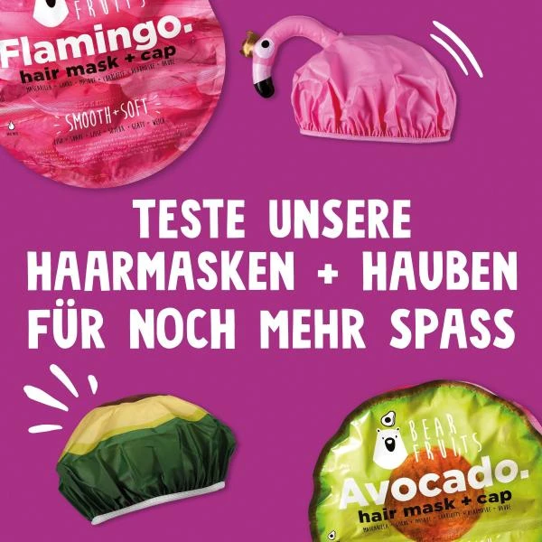 Die Bear Fruits Flamingo Haarmaske bändigt krauses Haar und macht es schön geschmeidig. Die Kombination aus Aloe Vera und Arganöl macht das Haar so weich, dass man es die ganze Zeit anfassen möchte. Wie eine Gesichtsmaske, nur für das Haar! Einfach die Haube aufsetzen und lächeln, während die Haarmaske das Haar verwöhnt. Bear Fruits Flamingo Haarmaske Nachfüllpack für 3 Anwendungen.