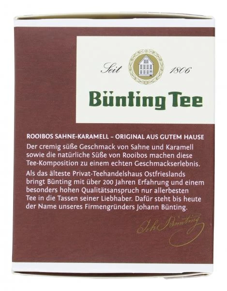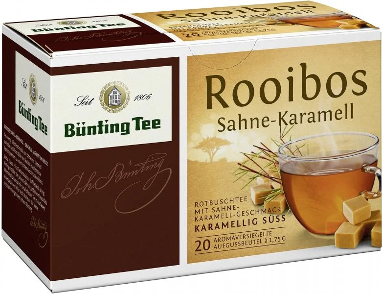 Der Rooibos (Rotbusch) wird in den Cedarbergen in Südafrika angebaut. Von Januar bis März werden die Zweige dieses Strauches geerntet. Rooibos-Tee besticht durch seine dezent natürliche Süße und wird ähnlich wie der bekannte Schwarztee verarbeitet. Beim Welken, Fermentieren und Trocknen entwickelt er sein beliebtes Aroma, ist aber absolut koffeinfrei. Rooibos-Tees schmecken sowohl heiß als auch kalt. Der cremig süße Geschmack von Sahne und Karamell sowie die natürliche Süße von Rooibos machen diese Tee-Komposition zu einem echten Geschmackserlebnis.