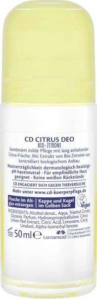 CD Citrus Deo Bio-Zitrone kombiniert milde Pflege mit lang anhaltender Citrus-Frische. Mit Extrakt von Bio-Zitronen aus kontrolliert biologischem Anbau. Für empfindliche Haut geeignet. Keine weißen Rückstände. Vegan.