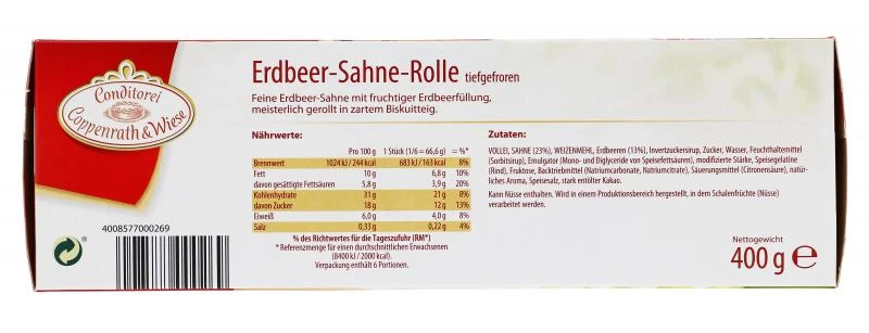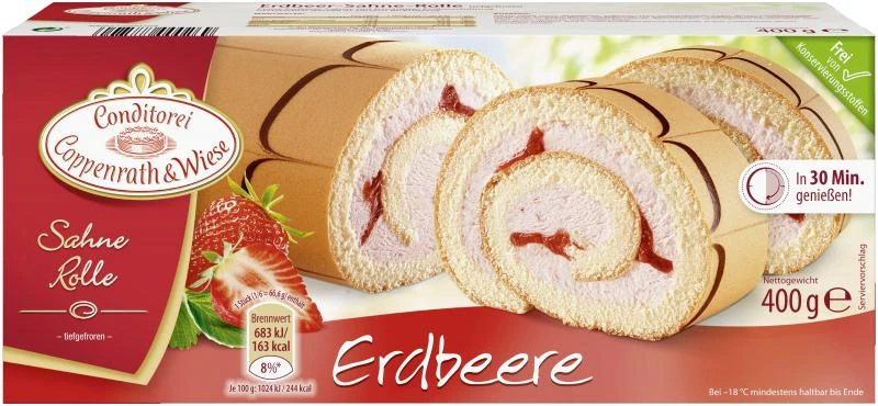 Leicht und fruchtig schmeckt die Erdbeer-Sahne-Rolle von Coppenrath & Wiese. Locker aufgeschlagene, frische Erdbeer-Sahne eingerollt in zartem Biskuitteig. Für den besonders fruchtigen Geschmack kommt noch eine Füllung aus fruchtigem Erdbeermousse hinzu. Mit dieser Rolle begeistern Sie Ihre Lieben zu jeder Gelegenheit.