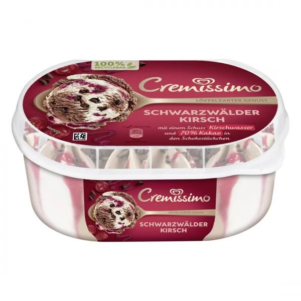Probiere die Interpretation von einem der bekanntesten Tortenklassiker. Löffelzartes Schokoladeneis und Eis mit Sahne sind von einer fruchtigen Kirschsauce durchzogen und mit knackigen Schokoladenstückchen sowie mit einem Schuss echtem Kirschwassers verfeinert.