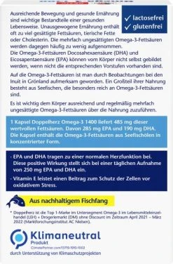 Ausreichende Bewegung und gesunde Ernährung sind wichtige Bestandteile einer gesunden Lebensweise. Unausgewogene Ernährung enthält oft zu viel gesättigte Fettsäuren, tierische Fette oder Cholesterin. Die mehrfach ungesättigten Omega-3-Fettsäuren werden dagegen häufig zu wenig aufgenommen.Die Omega-3-Fettsäuren Docosahexaensäure (DHA) und Eicosapentaensäure (EPA) können vom Körper nicht selbst gebildet werden, wenn nicht die entsprechenden Vorstufen vorhanden sind.Auf die Omega-3-Fettsäuren ist man durch Beobachtungen bei den Ureinwohnern Grönlands aufmerksam geworden. Ein Großteil ihrer Nahrung besteht aus Seefischen, die besonders reich an Omega-3-Fettsäuren sind. Es ist wichtig dem Körper ausreichend und regelmäßig mehrfach ungesättigte Omega3-Fettsäuren über die Nahrung zuzuführen. 1 Kapsel Doppelherz Omega-3 1400 liefert 485mg dieser wertvollen Fettsäuren. Davon 285mg EPA und 190mg DHA. Die Kapsel enthält die Omega-3-Fettsäuren aus Seefischölen in konzentrierter Form.EPA und DHA tragen zu einer normalen Herzfunktion bei. Diese positive Wirkung stellt sich bei einer täglichen Aufnahme von 250 mg EPA und DHA ein.Vitamin E leistet einen Beitrag zum Schutz der Zellen vor oxidativem Stress.Die Kapseln von Doppelherz enthalten in 1400mg Seefischöl 35% Omega-3-Fettsäuren und unterstützen so mit bereits 1 Kapsel täglich die Versorgung mit diesen wertvollen Fettsäuren.