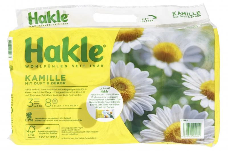 Toilettenpapier mit einzigartigen Wohlfühlkissen. Natürliche Pflege mit angenehmen Kamilleduft und Aloe-Vera-Extrakten. Lage um Lage hochwertig Hakle.