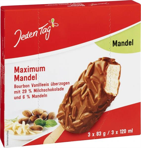 Bourbon-Vanille Eis, überzogen mit 29% Milchschokolade und 6% Mandeln.