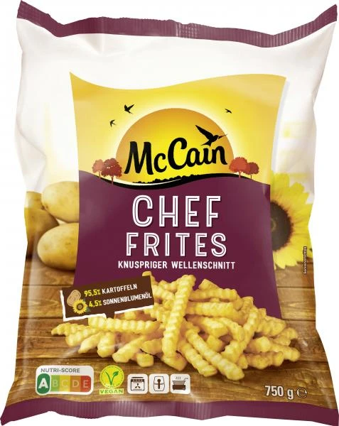 Die beliebten Chef Frites mit dem knusprigen Wellenschnitt. Geschnitten aus ganzen Kartoffeln, besitzen sie durch ihre Wellenform eine feine Knusprigkeit und bringen das gewisse Etwas auf den Teller.
