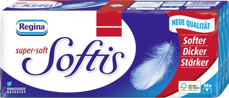 Super-softe Papiertaschentücher. 4lagig. Softer, dicker, stärker. Hautfreundlich, dermatologisch getestet.