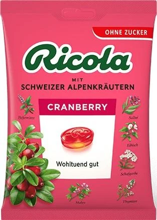Lecker erfrischend-fruchtiger Geschmack dank köstlicher Cranberries.Cranberries kommen ursprünglich aus Nordamerika und sind mit den europäischen Preiselbeeren verwandt. Reif sind sie tiefrot und enthalten Beta-Carotin und Mineralstoffe. Schon die nordamerikanischen Ureinwohner nutzten die Kraft der Beeren. Im zuckerfreien Cranberry-Bonbon kombiniert Ricola Cranberry-Saft mit dem Besten aus 13 Schweizer Bergkräuter. Ein wohltuender und erfrischender Genuss.