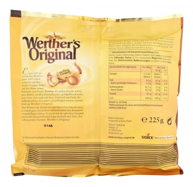 Werther’s Original Karamell Creme. Karamellcreme gefüllte Sahnebonbons. Es geschah im Städtchen Werther anno 1909. Dort schuf der Zuckerbäcker Gustav Nebel auf der Höhe seines Könnens sein bestes Bonbon. Er nahm frische Sahne, gute Butter, weißen Kristallzucker, goldgelben Kandis, eine Prise Salz und viel Zeit. Und weil am Ende die Sahnebonbons besonders gut gelungen waren, nannte man sie Werther’s Original. Nun können Sie diesen einzigartigen Geschmack auch in einem ganz besonderen Sahnebonbon mit Karamellcremefüllung erleben. Es wird mit der gleichen Sorgfalt und Liebe hergestellt und trägt deshalb mit Stolz denselben großen Namen: Werther’s Original.